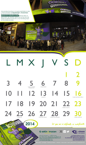 Hoja de Noviembre del calendario de 2014 de Questión de Imagen y Cícero Artes Gráficas.