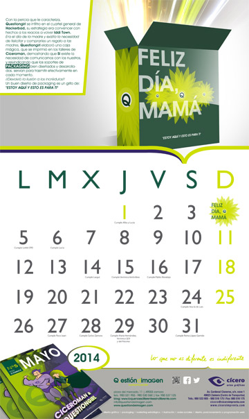 Era el Día de la Madre y existía la necesidad de felicitar y comprarles un regalo a las madres. Questiongirl elaboró una caja mágica, que se imprimió en los talleres de Cíceroman, demostrando que SÍ existe la necesidad de comunicarnos con los nuestros y reivindicando que los soportes de PACKAGING bien diseñados y desarrollados, servían para transmitir efectivamente en cada momento.