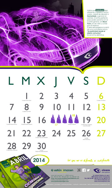 Hoja de Abril del calendario de Questión de Imagen y Cícero Artes Gráficas.
