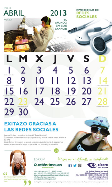 Os presentamos la hoja de Abril del calendario de 2013 de Questión de Imagen y Cícero Imprenta, dedicada a las Redes Sociales.