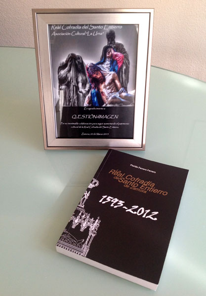 Reconocimiento del Santo Entierro a Questión de Imagen junto con un ejemplar del libro