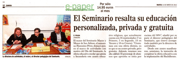 Nota de prensa de El Adelanto publicada el 13 de Marzo de 2012. En la fotografía, la directora de actividades, el rector y el director pedagógico del Seminario con algunos de los artes finales diseñados por QdI