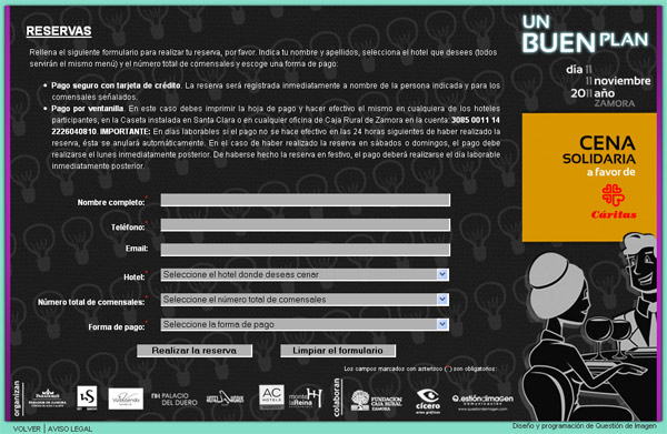Desde hoy mismo ya es posible realizar reservas para la cena solidaria. Es muy fácil. Sólo hay que rellenar el formulario, seleccionar el número de comensales y el hotel deseado y seleccionar la forma de pago: tarjeta de crédito o débito o bien pago por ventanilla.