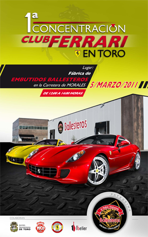 El próximo sábado 5 de Marzo de 2011 tendrá lugar la Primera Concentración del Club Ferrari en Toro de 12:00 a 14:00 en la fábrica de Embutidos Ballesteros. Elier Ballesteros nos confirmaba la presencia de 25 Ferraris en la concentración, que esperan que cuente con una multitudinaria asistencia.