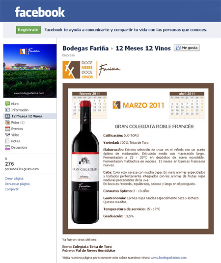 En Enero de este año, Bodegas Fariña presentó su campaña 12 meses 12 vinos a través de Facebook. Cada mes recomiendan un vino y es posible consultar la ficha completa del vino a través de la red social. Este mes de Marzo recomiendan uno de sus vinos más destacados: Gran Colegiata Roble Francés.
