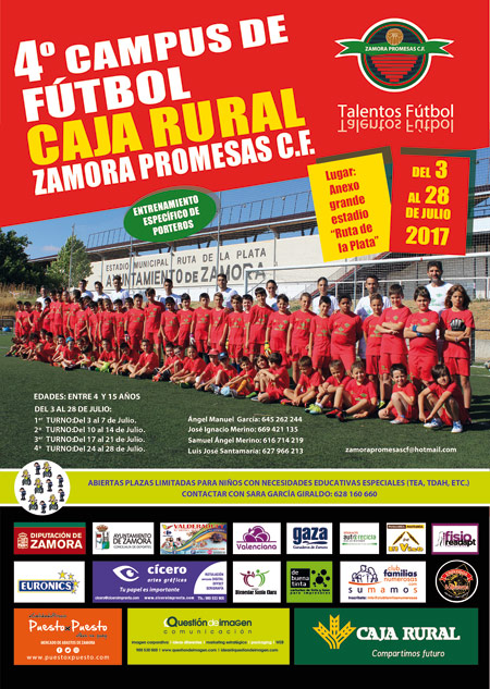 Un año más en Questión de Imagen Comunicación hemos tenido el placer de diseñar el cartel del Campus de Fútbol Zamora Promesas C.F. que se llevará a cabo del 3 al 28 de Julio de 2017 en el anexo grande del estadio "Ruta de la Plata" como en ediciones anteriores.