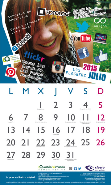 Hoja de Julio del calendario de 2015 de Questión de Imagen Comunicación y Cícero Artes Gráficas.